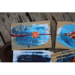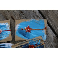 Formes en céramique blanche ou rouge, émaillée. Perles en verre. Lien en nylon coloré assorti.