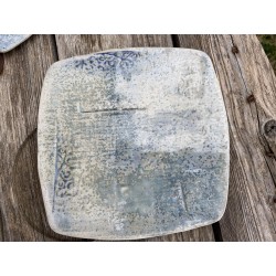 Assiette en grès, émaillée en blanc avec des effets de bleu.